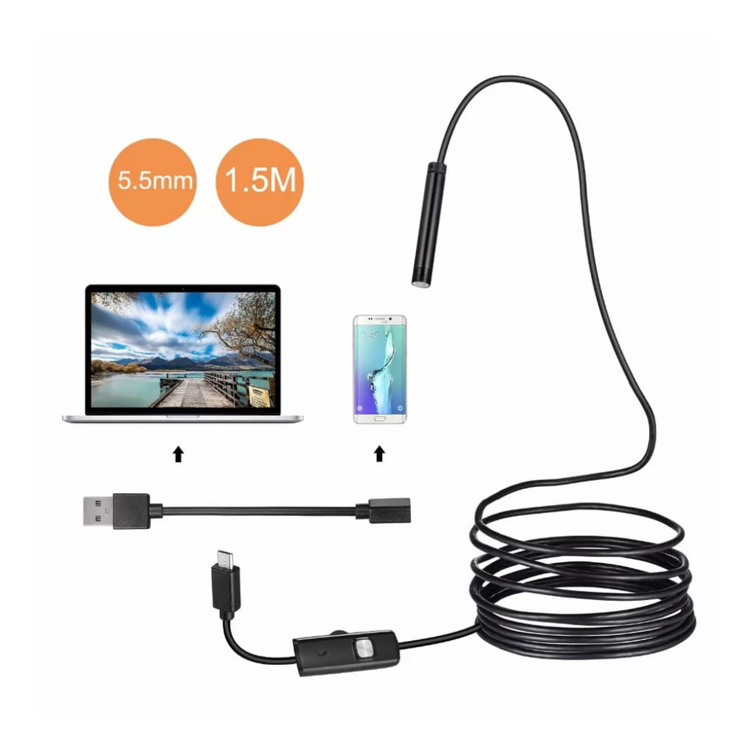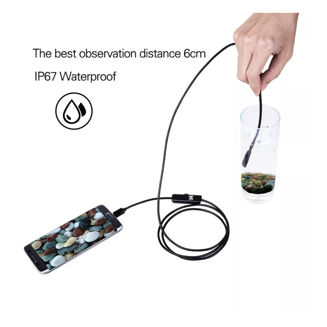 Especificaciones:- Compatible: Android (soporte OTG y UVC) y Windows XP/7/8/VISTA/Mac.- Cable flexible de 5 metros.- IP67- Conector USB 2.0 y micro USB con adaptador Tipo C.- Fuente de alimentación: DC 5V / 0.1A- Cámara 1/6 "COMS VGA- Pixel VGA 300K- Resolución 640*480- Diámetro de la cámara 10mm- Amplio ángulo de vista visual 62°- 6 luces LED, brillo ajustable.- Distancia focal - 6cm- 24 bits de color